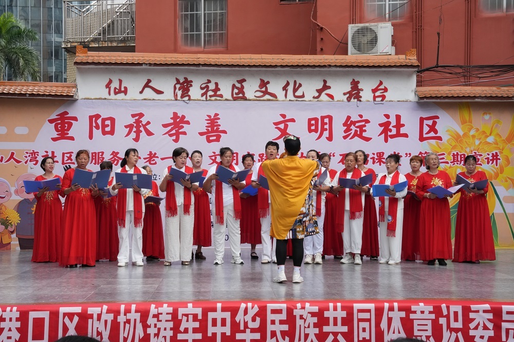 活动伊始,仙人湾社区“石榴讲堂”第三期宣讲如期开讲,宣讲内容围绕民族团结与基层治理展开,引导在场党员干部与社区居民进一步凝聚“民族团结一家亲”的共识,为后续活动奠定温暖和谐的基调。文艺表演环节亮点纷呈:传承好家风手语操传递家庭和睦正能量,老年大学学员演唱饱含温情,朗诵与独弦琴演奏尽显传统文化魅力,《灯火里的中国》手语操更将氛围推向高潮。表演后,儿童为参演老人献花,还主动为在场老人捶背揉肩,稚嫩问候让敬老爱老种子在孩童心中扎根