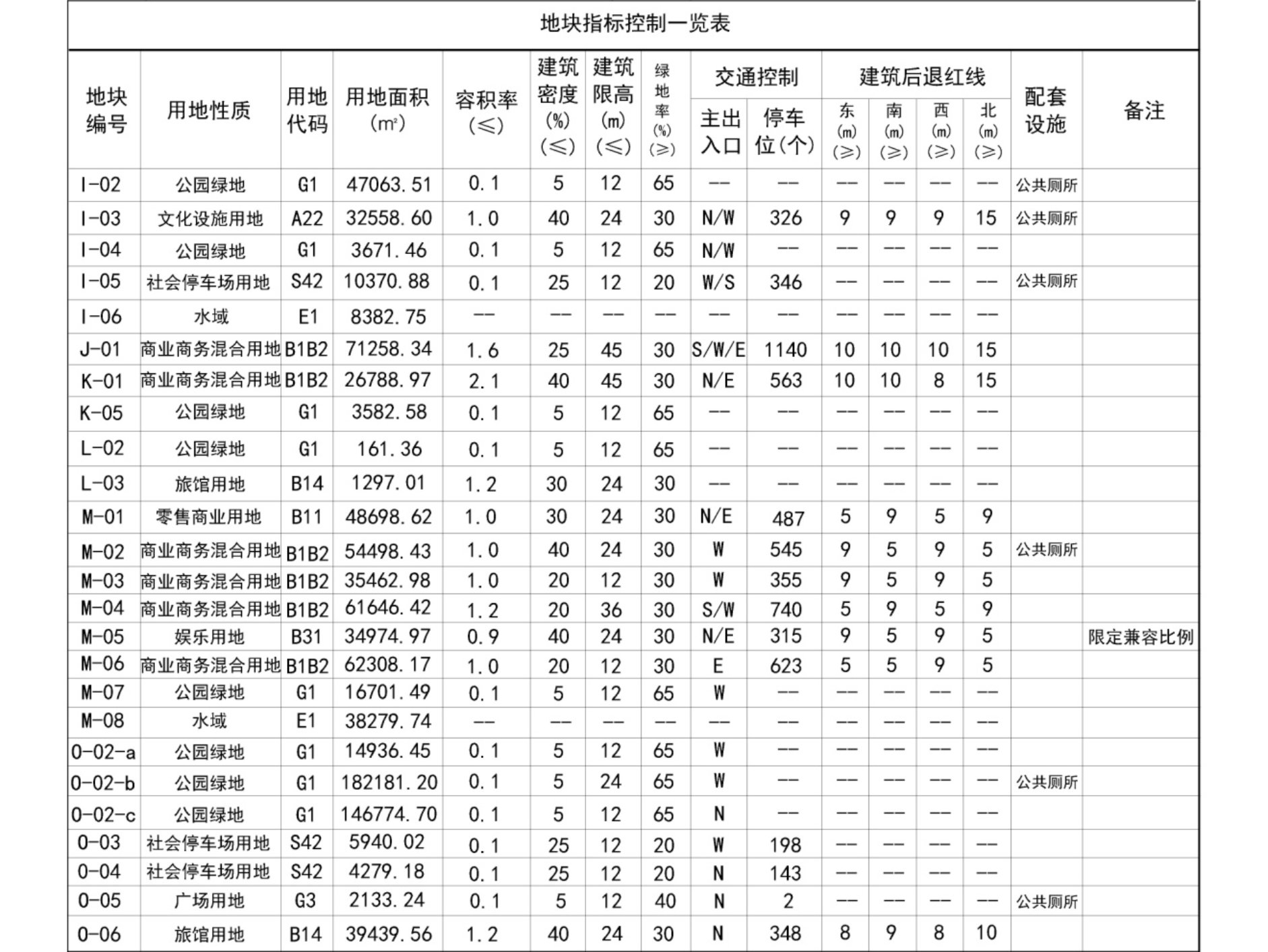 (一) 批准规划设计条件:总用地面积1047747.96㎡,合1572亩,用地性质为零售商业用地、商业商务混合用地、文化设施用地、娱乐用地、旅馆用地、公园绿地、社会停车场用地、广场用地、水域,各地块规划控制指标及指标附表如下: