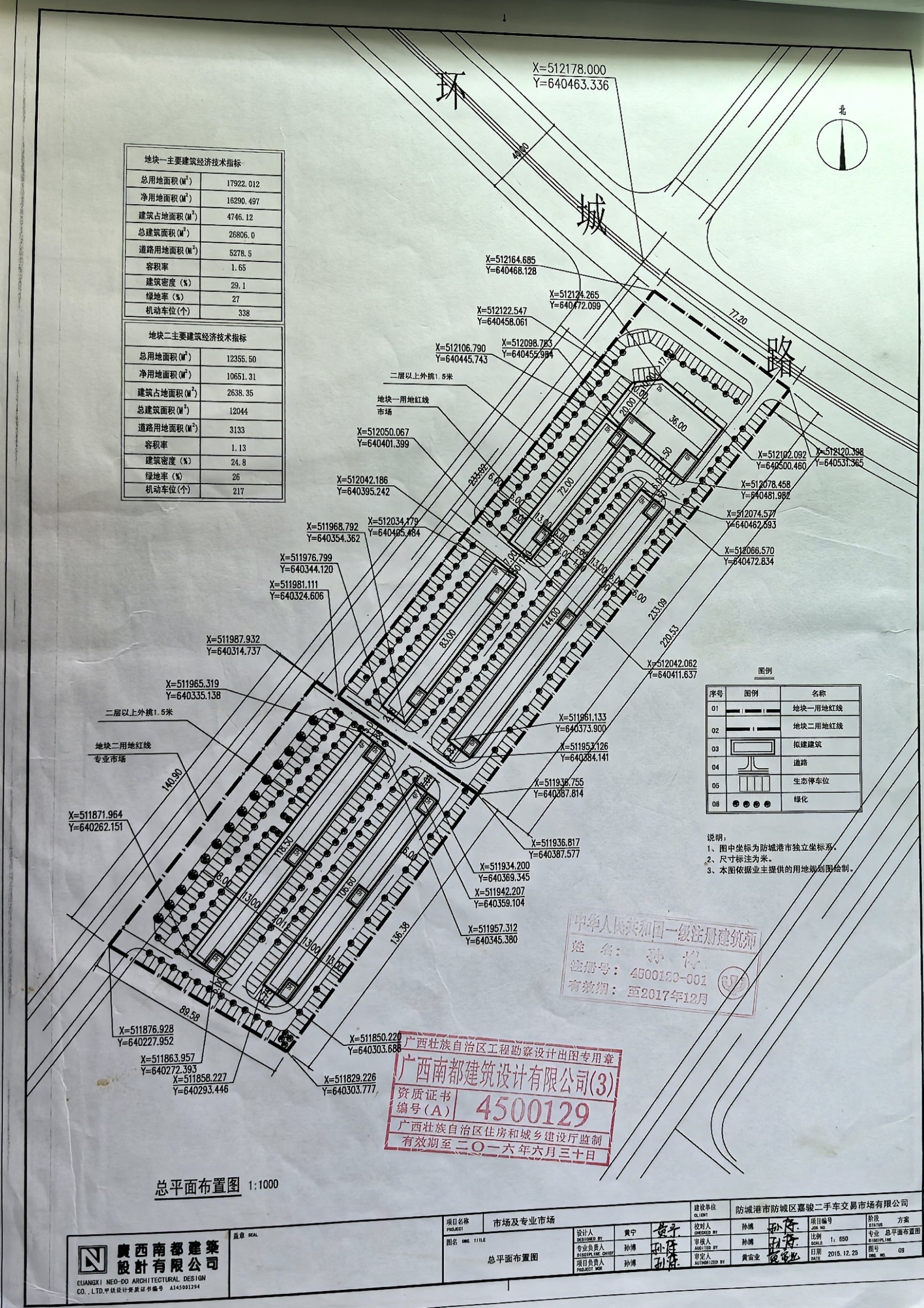 (一) 批准规划设计条件(地字第450603201300241号):地块总用地面积17922.012㎡,净用地面积16290.497㎡,用地性质为专业市场用地,建设规模:≤40726.24㎡,容积率:1.0<D≤2.5,建筑密度:≤30% ,绿地率:≥25%,建筑限高 :≤36m。(地字第450603201400132号):地块总用地面积12338.53㎡,净用地面积10651.31㎡,用地性质为批发零售用地,建设规模:≤15976.97㎡,容积率:1.0≤D≤1.5,建筑密度:≤30% ,绿地率:≥25%,建筑限高 :≤14m。