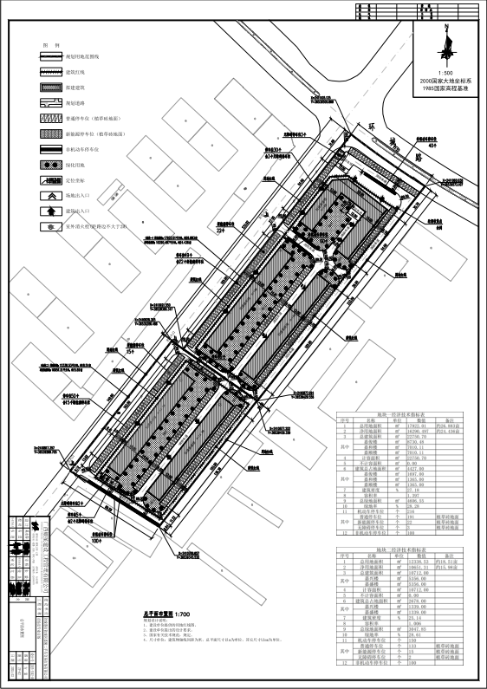 (二)建设内容:地块一总用地面积为17922.012㎡,净用地面积为16290.497㎡,总建筑面积为22750.70㎡,容积率为1.397,建筑密度为27.18%,机动车位:216个,绿化率:28.28%。地块二总用地面积为12338.53㎡,净用地面积为10651.31㎡,总建筑面积为10192.0㎡,建筑密度为23.92%,机动车位:150个,绿化率:29.84%。