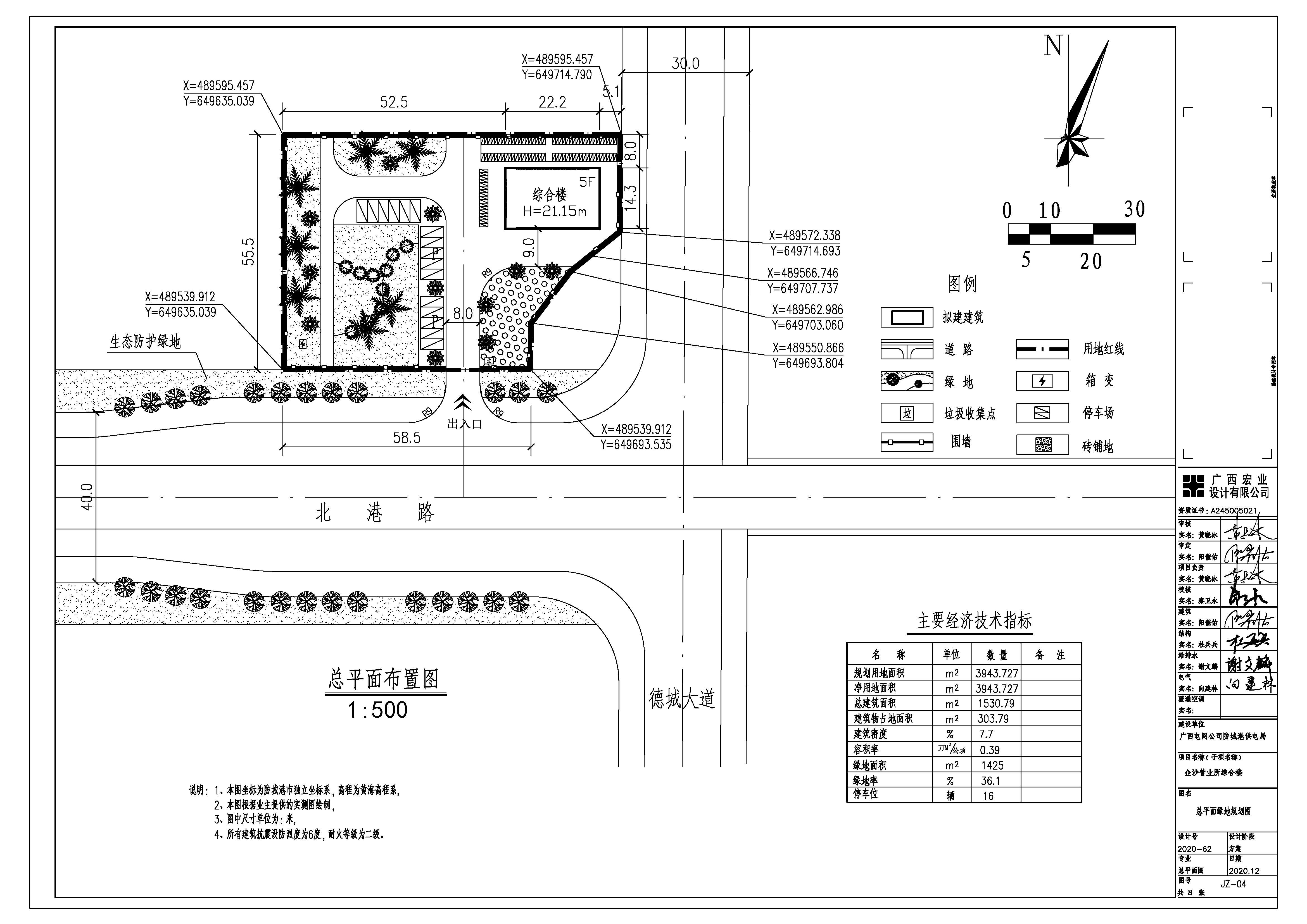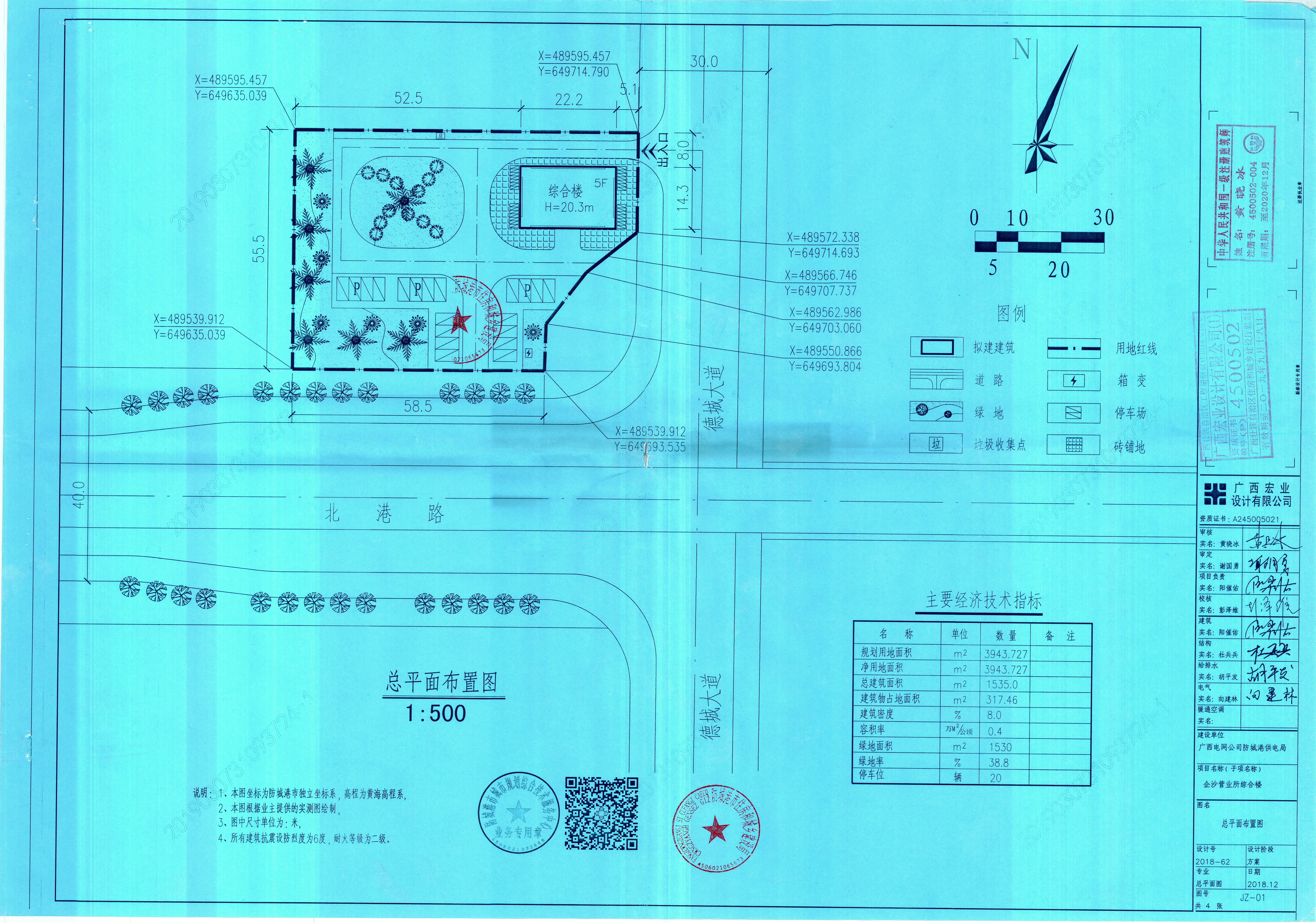 (一)批准规划设计条件(地字第450602201800436号):总(净)用地面积3943.727㎡,用地性质为商务用地,建设规模≤10253.69㎡,容积率≤2.60,建筑密度≤30%,绿地率≥30%,建筑限高 ≤50米。